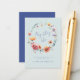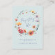Cette conception présente une délicate couronne aquarelle faite de fleurs sauvages dans des nuances de bleu, rouge, orange, violet et or. Parfait pour les mariages en plein air au printemps et en été.