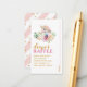 Billet de tombola pour Baby shower avec illustration d'une belle licorne assise entourée de fleurs. Le dos est aquarellé blanc et rose rayures et une douche de parties scintillant dorée.