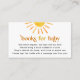 Une carte d'insertion de demande de livre pour le baby shower. Doté d'un soleil d'aquarelle avec du texte rétro et du poème : "UNE PETITE DEMANDE, NOUS ESPÉRONS NE PAS TROP DUR S'IL VOUS PLAÎT APPORTER UN LIVRE PLUTÔT QU'UNE CARTE ILS CHERCHERCHERONT LE LIVRE, BIEN AIMÉ OU NEUF S'IL VOUS PLAÎT SIGNER L À L AVEC UN MESSAGE DE VOUS!"