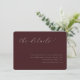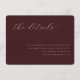 This elegant wedding enclosure card features a sophisticated maroon background with an understated, cursive typography that exudes timeless charm. The design is simple yet refined, focusing on providing essential details in a graceful manner. Perfect for couples aiming to maintain a classic and polished aesthetic at their special event, this card ensures all guests have the necessary information while complementing the overall wedding theme. Its clean layout allows it to seamlessly integrate into any formal or traditional wedding setting.