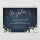 Calligraphie de réception moderne en faux or et fleurs blanches aquarelles eucalyptus verdure sur fond bleu marine foncé, élégant et stylé, idéal pour un mariage rustique verdure, mariage de jardin botanique, mariage floral boho en été et en hiver.