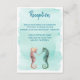 Les cartes d'accompagnement de réception de mariage sur le thème nautique et plage présentent un joli couple d'hippocampes s'embrassant sur un fond de lavis aquarelle "océan". Le verso est d'un joli bleu marine. Personnalisez avec les détails de votre réception. Œuvre originale KL Stock. Visitez ma collection de mariage "Mer d'amour" pour des invitations, des cartes d'accompagnement coordonnées, etc.