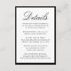 This wedding details card features “Details” in elegant black calligraphy script at the top, followed by your custom wedding information presented in classic serif lettering. A bold black border frames the design, creating a clean, refined look that feels timeless and polished. The structured layout provides a beautiful way to share accommodations, weekend events, and important information with your guests, making this black and white details card ideal for modern, classic, and formal wedding celebrations. Personalize the wording to create an insert that feels cohesive, elevated, and thoughtfully designed.