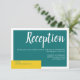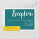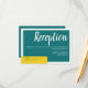 Carte minimaliste et contemporaine d'enceinte de réception de mariage avec un agencement moderne en vert turquoise et jaune. Le mot Réceptions est présenté dans une police de calligraphie blanche en gras sur un arrière - plan vert turquoise, tandis que les détails de la réception sont écrits dans une police blanche moderne. Le dos de la carte est personnalisable avec les initiales de la mariée et du marié et votre texte d'information facultatif (modifier ou supprimer l'exemple de texte). Modifiez facilement les champs de modèle pour ajouter vos informations de réception. Faisant partie de la collection "Moderne turquoise vert & jaune mariage", cet article est également disponible en gris, violet et bleu ; mélangez différentes couleurs pour un faire-part de mariage unique. Pour plus de personnalisation, de changement de couleur ou de commandes personnalisées, n'hésitez pas à me contacter à acherryonthecake@hotmail.com (veuillez prévoir 1-2 jours ouvrables).