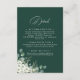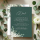 Assurez-vous que vos invités ont toutes les informations essentielles avec notre carte de détails Mariage Modern Emerald Green. Conçue avec une étonnante aquarelle de feuilles d'eucalyptus et de délicates fleurs de jasmin, cette carte complète parfaitement votre thème mariage de verdure ou d'aquarelle. Son style élégant, d'inspiration nature, apporte une touche raffinée tout en informant vos clients sur l'hébergement, les détails du lieu ou les événements spéciaux.