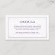 Simple petite carte de boîtier mariage avec un design moderne mais élégant avec vos détails entourés d'une fine bordure et votre monogramme sur le dos. Tous les éléments de conception sont en violet et peuvent être modifiés dans l'outil d'édition de conception. Un design chic et design qui conviendra à un couple minimaliste. Utilisez ces cartes d'enclos pour indiquer l'itinéraire et tout autre détail important que vos invités pourraient avoir besoin de connaître, comme l'hébergement à l'hôtel, le stationnement, les informations sur la navette, etc.