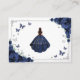 Navy blue, silver and white Quinceanera reception details enclosure cards. Features brunette girl in ball gown dress, script font, silver butterflies, dark blue roses and tiara. Perfect for an elegant princess style glam celebration. Personalize with your own details.