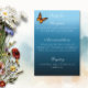 Papillons monarques élégants orange sur fond ombré bleu, créant un design romantique et inspiré de la nature. Parfait pour les mariages en plein air, de jardin ou à thème papillon.