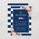 Carte de réception de mariage élégante avec fleurs et rayures bleues marine.