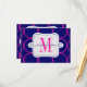 Carte de réception de mariage moderne rose fuchsia et bleu marine avec monogramme initial et motif de cercle gras. Personnalisez avec vos informations et vos choix de couleurs. Vous pouvez changer la couleur de fond des cercles dans le motif en utilisant le menu d'édition et en changeant la couleur de l'arrière-plan. Elke Clarke©