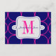 Carte de réception de mariage moderne rose fuchsia et bleu marine avec monogramme initial et motif de cercle gras. Personnalisez avec vos informations et vos choix de couleurs. Vous pouvez changer la couleur de fond des cercles dans le motif en utilisant le menu d'édition et en changeant la couleur de l'arrière-plan. Elke Clarke©