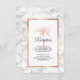 Fournissez à vos invités tous les détails de votre réception de mariage avec cette élégante carte d'enceinte avec script moderne, texte gris charbon de bois, y compris un palmier artistique et cadre en cuivre or rose métallique sur le devant de la carte. Un arrière - plan en marbre blanc et gris se trouve à l'avant et à l'arrière.