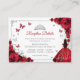 Red silver and white Quinceanera reception details enclosure cards. Features brunette girl in ball gown dress, script font, silver butterflies, red roses and tiara. Perfect for an elegant princess style glam celebration. Personalize with your own details.