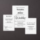 Partagez vos informations sur le registre des cadeaux mariages avec les invités à l'aide de cette carte en texte clair noir et blanc. Un design pour les couples ou les hôtes qui préfèrent le texte brut sans éléments dans l'arrière - plan pour faciliter la lecture. Les textes noirs contrastant avec l'arrière - plan blanc améliorent également la lisibilité. Les textes sont centrés et les polices utilisées sont la calligraphie, le script et sans serif. La calligraphie et les polices de script sont utilisées pour améliorer le style tandis que la police sans serif est utilisée pour améliorer la lisibilité et la clarté. Customisez-le en tapant les noms de la mariée et du marié et les détails de la réception. Vous pouvez également modifier le contenu ou les mots de l'outil de conception, y compris le style de police, la couleur de police et la couleur arrière - plan. Veuillez vérifier l'apparence des côtés avant et arrière après avoir tapé des textes. Si l'apparence vous plaît, vous pouvez passer votre commande maintenant. Si vous avez besoin de redimensionner ou de repositionner les textes, s'il vous plaît ajuster dans l'outil de conception. À la mariée et au marié, félicitations à votre fiançailles ! Je vous souhaite à la fois une vie remplie d'amour et de bonheur.