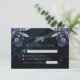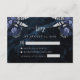 Cette élégante carte de réponse de mariage comporte des bouquets floraux bleus marine rehaussés de feuillage en faux foil argenté dans deux coins, sur une image de fond d'agate aquarelle bleue marine. Le texte personnalisable combine des polices sérif et manuscrites gris argenté. Le verso présente un design floral et d'agate bleu marine et argenté assorti.