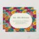 This is a cheerful and colorful style image featuring an array of bright, blooming flowers in shades of orange, pink, yellow, and teal. The floral background creates a lively and festive atmosphere, perfect for celebrating special occasions like weddings. At the center, an elegant white oval frame contains text inviting guests to visit a wedding website for more details on accommodations and additional information. It exudes warmth and joy, making it ideal for adding a touch of nature's beauty to your wedding invitations or announcements.