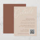 Une carte d'accompagnement polyvalente pour vos invitations de mariage, cette petite carte Details offre trois champs de texte personnalisés pour les détails de votre mariage, votre site web et un code QR pour les réponses ou des informations supplémentaires. Conçue pour correspondre à notre collection de mariage Script Watermark. Notre palette de couleurs Sable est un mélange élégant de tons terreux, avec des lettrages en crème pâle et en argile terracotta sur un fond beige sableux doux.