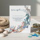 La carte de réception de mariage à thème plage comprend un hippocampe, un coquillage, une étoile de mer et un corail avec les détails de votre célébration tels que l'heure et l'emplacement en lettres bleues poussiéreuses. Idéal pour les mariages de plage, côtiers, nautiques, de destination et tropicaux. Art par KL Stock