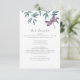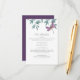 Cette simple carte de mariage détails de jardin moderne présente une libellule d'aquarelle dans les tons violet et rose. Il repose sur un agencement simple de verdure naturelle de jardin d'aquarelle sur un arrière - plan blanc. Le dos est un violet profond solide qui correspond à la libellule.