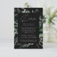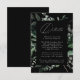 Elégante carte de détails de mariage botanique avec vos détails nichés dans un cadre rectangulaire entouré d'eucalyptus, fougères et autres riches verdure sur un arrière - plan noir. Ajoutez des détails tels que l'hébergement à l'hôtel, les informations sur la réception de bienvenue, le site du mariage, etc. Conçu pour coordonner avec notre collection de mariages de verdure Abondante.