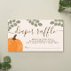 Un billet de tirage de couche pour une baby shower automnale sur le thème de l'automne, neutre en termes de sexe. Ce design moderne de baby shower automnale présente une police de caractères à calligraphie moderne, des citrouilles orange et des branches d'eucalyptus vertes.