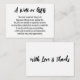 Ces inserts de carte simples et distinctifs présentent des polices contrastées par rapport à un arrière - plan solide. À l'avant, dans un script d'écriture moderne et audacieux, un en-tête indique "Une note sur les cadeaux" ; à l'arrière, "Avec l'amour et les remerciements". Le corps avec votre message plus long a été rendu dans une minuscule police sans-serif. Mon message porte-monnaie dit : "La chose la plus importante est de vous avoir avec nous lors de notre journée spéciale. Aucun cadeau n'est nécessaire ou attendu, mais on nous a demandé ce dont nous avions besoin ou ce que nous voulions. Si vous voulez nous donner quelque chose, un peu d'argent à dépenser pour notre lune de miel serait très apprécié." N'hésitez pas à utiliser les champs modèle et à modifier n'importe quel aspect de la copie avec votre propre message personnel. De même, les polices, les couleurs et la disposition peuvent être modifiées de n'importe quelle façon. Faites de ces cartes polyvalentes vos propres cartes.