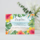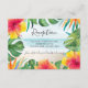 La carte de réception de mariage à thème de l'île tropicale comprend un arrière - plan de plage abstrait, encadré de fleurs d'hibiscus aquarelle, de palmiers et de feuilles monstères avec lettrage gris charbon de bois. Le côté inverse est bleu aqua. Parfait pour la destination, la plage et les thèmes côtiers. Oeuvre de KL Stock.