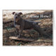 Cette carte dit, "Bienvenue à la maison." A l'intérieur, on dit : "Maintenant, JOUONS !" Une adorable carte montrant un beau Pitbull de Nez Bleu nommé Sarge. Sarge se tient avec ses deux pattes avant sur son jouet préféré, un skateboard. Ses pattes arrières sont étendues et ses oreilles sont hautes et alerte, ce beau chien vous regarde dans une position parfaite.