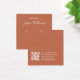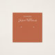 Une carte d'oreille minimaliste en terre cuite : texte blanc sur arrière - plan en terre cuite, avec les places d'erring indiquées par deux très petits cercles. Le nom est écrit dans un script élégant. Il a une morue QR à l'arrière, dans la partie inférieure, à gauche de l'info.