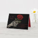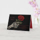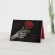 Une carte de vœux sombre et romantique représentant une main de squelette tenant une seule rose rouge, avec la phrase "Amour qui hante" dans une police d'écriture effrayante et un message poétique en dessous.