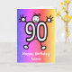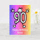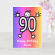 Dessin animé mignon d'un chiffre 90 avec un visage souriant et des mains et des pieds. La carte a un fond à effet pailleté coloré. Envoyez cette carte pour souhaiter un joyeux 90e anniversaire ! Personnalisez facilement cette carte en modifiant le texte du modèle sur le devant et à l'intérieur. Merci de consulter mes créations !