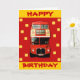 Carte d'anniversaire avec l'emblématique Routemaster London Bus placé sur un carré rouge avec de petits carrés jaunes éparpillés autour. Gras Happy Birthday salutations sur le devant et à l'intérieur, personnalisable.