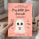 Carte d'anniversaire sur le thème d'Halloween adorable avec un fantôme kawaii tenant un cœur rouge, entouré de chauves-souris volantes et de détails effrayants pastel. Parfait pour les fêtes d'octobre des enfants, les anniversaires d'automne et les célébrations d'Halloween pas trop effrayantes. Ce design de fantôme pastel mignon est doux, festif et idéal pour ajouter une touche de plaisir à toute réunion de saison effrayante.