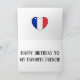 Belle conception comprend des ballons heureux et des bandes-tiques avec les mots "Joyeux anniversaire", le tout aux couleurs du drapeau français. Le design est fini avec le coeur dans les couleurs du drapeau français et le message d'anniversaire qui est entièrement personnalisable. Cette carte d'anniversaire colorée est le cadeau parfait pour votre ami de France.