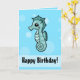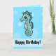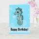 Une carte d'anniversaire avec une adorable illustration numérique d'un mignon petit cheval de mer en caricature bleue sur un arrière - plan recouvert de bulle verte de mer. Vous pouvez customiser tout le texte pour le rendre aussi individuel que vous le souhaitez !
