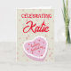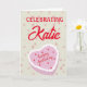 Magnifique Carte Florale Personnalisée D'Anniversaire Avec Pétales Rose Arrière - plan Et Un Coeur En Forme De Gâteau D'Anniversaire Rose. Salutation extérieure célébrant le nom et Joyeux anniversaire sur le gâteau.