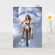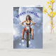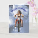 Une belle fille à vélo à travers les étoiles dans le ciel. Une carte d'anniversaire très différente pour l'homme qui aime rouler.