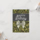 Carte d'anniversaire personnalisée avec "Joyeux anniversaire" en typographie mixte, arc en argent, ruban satiné, et arrière - plan camouflage vert.