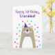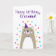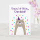 Carte d'anniversaire pour grand-père. Si vous appelez votre grand-père grand-père au lieu de grand-père, cette carte d'anniversaire est parfaite pour lui. Votre grand-père va adorer le design mignon, moderne, coloré, scandinave de cette carte d'anniversaire qui comprend un ourson en peluche marron et gris avec un casquette de fête violet et un confetti rose, jaune et bleu avec le texte "Joyeux anniversaire, grand-père !" Rendre cette carte personnalisable ! Cliquez sur "Edit Design", "Inside Bottom/Right : Text & Images", "Text" et "Add text" pour écrire votre propre message personnalisé à Grand-père à l'intérieur !