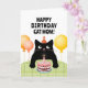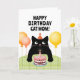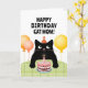 Carte d'anniversaire pour maman chat avec un petit chat noir, gâteau d'anniversaire et ballons.