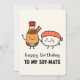 Célébrez votre personne préférée avec cette adorable carte d'anniversaire "Soy-Mate" ! Avec un rouleau de sushi souriant et une bouteille de sauce soja, ce design de style kawaii est parfait pour les couples, les meilleurs amis ou quiconque aime les jeux de mots sur la nourriture. Imprimé avec des couleurs vives et un message ludique : "Joyeux Anniversaire à mon Soy-Mate !" – cela va certainement les faire sourire.