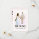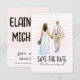 Un design simple et moderne pour annoncer la date. Le recto présente l'illustration d'une mariée et d'un marié se tenant par la main, accompagnée de l'annonce "save the date". Le verso suit le thème de couleurs rose, marron et blanc. Il comporte le nom de la mariée et du marié en grandes lettres grasses en haut. Et en bas, suivent la date et les détails du lieu.