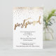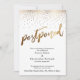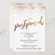 Si vous devez informer votre entourage d'une nouvelle date de mariage, ce modèle festif pourrait être exactement ce que vous cherchez ! Dans ce design, la police de caractères manuscrite a été utilisée pour créer un graphique qui indique "reporté" en gros caractères gras ; l'image a été rehaussée d'un effet doré métallisé. Le haut des deux côtés a été accentué avec une image qui simule des confettis dorés assortis qui semblent tomber d'en haut. Utilisez les champs du modèle pour ajouter vos informations personnelles et rendre ce design unique et moderne vôtre. L'arrière-plan peut être changé en n'importe quelle couleur de votre choix. // 100 //