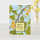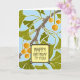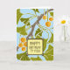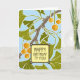 Carte d'anniversaire de conception "Danse de Ginkgo" Arts & Crafts. Ce design de style d'impression de bloc présente des feuilles de Ginkgo vertes ondulant ou 'dansant' dans une brise d'été sur fond de ciel bleu avec des fruits marbrés orange et jaune suspendus par de fines branches vertes pendantes.