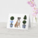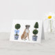 Cette papeterie présente un portrait aquarelle d'un chiot boxeur assis entre deux topiaires de style chinoiserie.