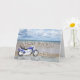 Un moto bleu debout sur une plage aux nuages moelleux dans le ciel. Joyeux anniversaire écrit dans la roche reflété dans l'eau couchée sur le sable.
