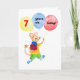 Une carte d'anniversaire pour un enfant de 7 ans avec une souris cheeky peinte à la main, tenant un cadeau et des ballons avec les mots "7 ans aujourd'hui! Le texte intérieur est 'Joyeux anniversaire'