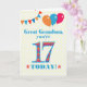 Carte d'anniversaire colorée pour un arrière-petit-fils de 17 ans, Le grand numéro 17 est rempli d'un motif orange, rouge et bleu, surligné de bleu vif. Il y a des ballons et du bunting en haut, dans des couleurs assorties et l'accueil à la couverture est : "Grand petit-fils, tu as 17 ans aujourd'hui !" en lettres rouge et bleu vif, sur un arrière - plan à pois jaune et blanc très pâle, avec des étoiles rouges et oranges de chaque côté du mot "AUJOURD'HUI !". Le message intérieur peut être facilement customisé ou supprimé si vous le souhaitez.