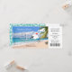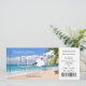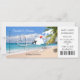 Une faire-part de mariage amusante mais élégante dans un style carte d'embarquement/billet pour les couples se mariant à l'étranger aux îles Fidji, illustrée dans une silhouette carte blanche sur une scène générique de plage et de palmiers, avec des coeurs d'amour rouge sucré, silhouette plane et forme de coeur tourbillonnant. Le verso de la carte d'embarquement offre beaucoup plus de détails et un joli motif en dentelle.