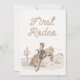 Carte de capsule temporelle pour le premier anniversaire sur le thème du premier rodéo d'un garçon, représentant un cowboy et un cheval, un paysage désertique, et un texte de style corde au dos.